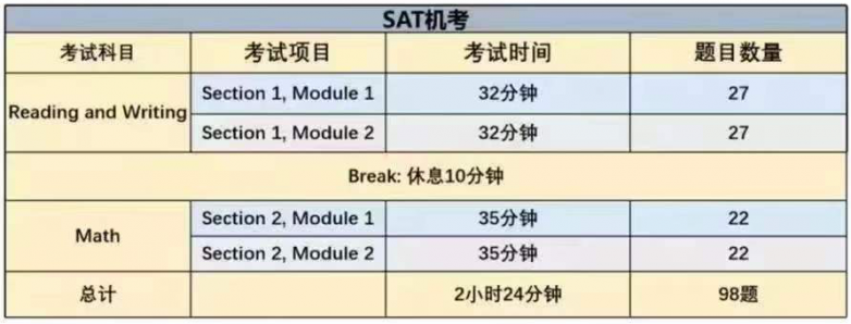 4. SAT考试为自适应模式,包括语文和数学两大块,每块分Module1+Module2。Module2的题目难度,根据Module1的做题情况而定。具体时间安排如下: